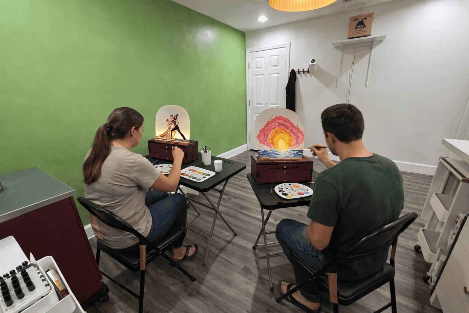 Come to our studio to choose designs, build your stage, and paint a scene in person with guidance.