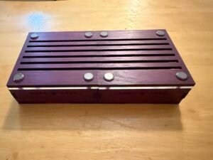 Engraved acrylic designs sit on top of a wooden box, AKA, the stage. An LED light shines from inside the box upward through the slots, illuminating the engraved designs to create a scene.