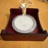 A lens slides into a slot on top of the stage (box). The stage holds an LED light that shines upward through the lens, highlighting the engraved design.