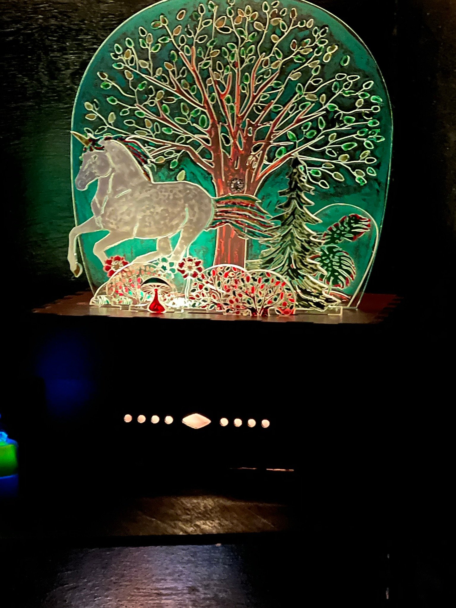 The LED light shines from inside the box upward through slots in the lid (to illuminate engraved designs of lenses placed on top of the box).