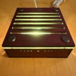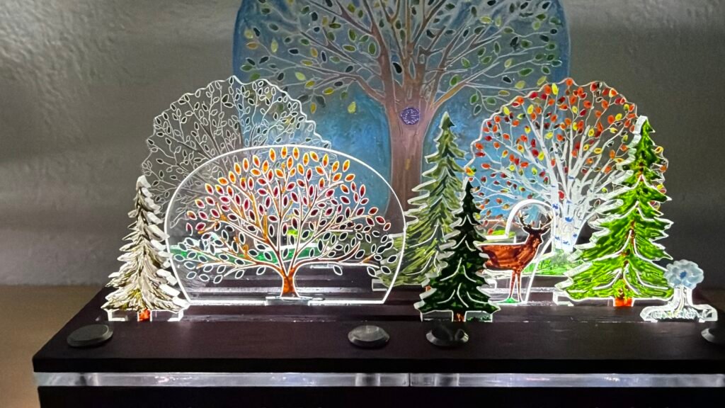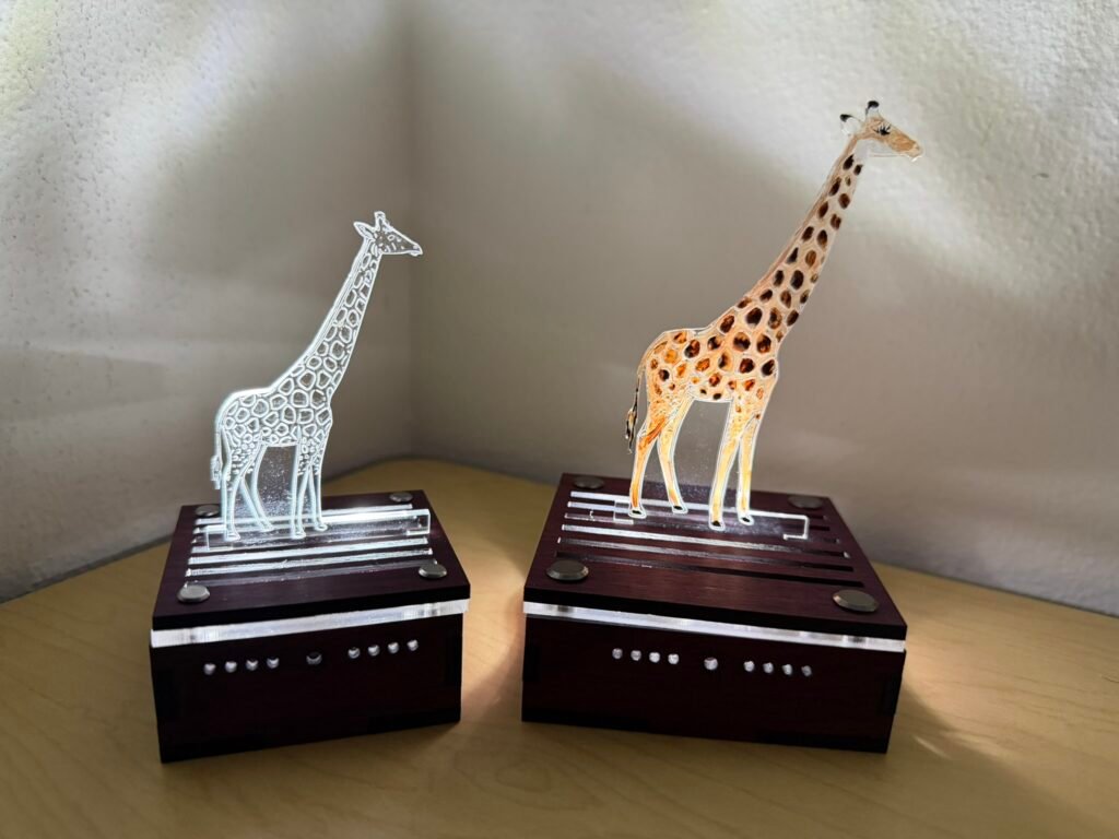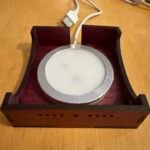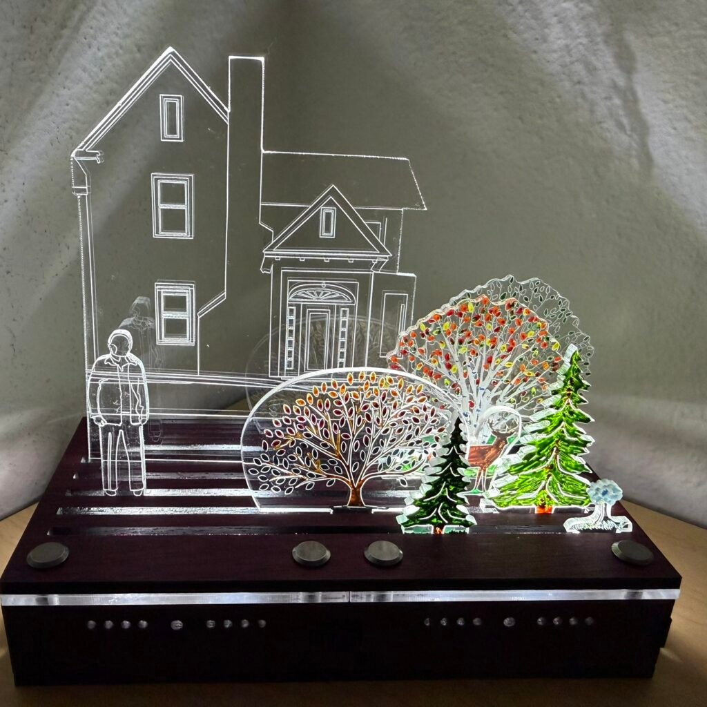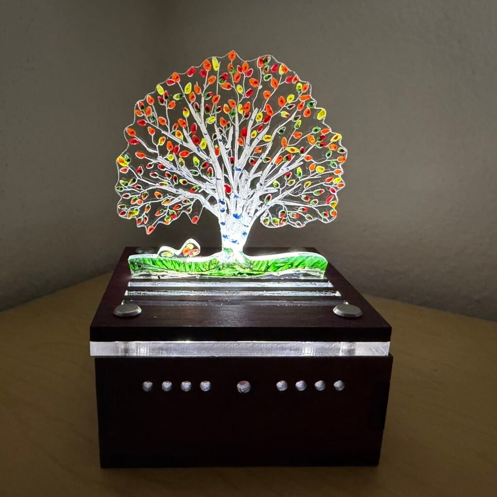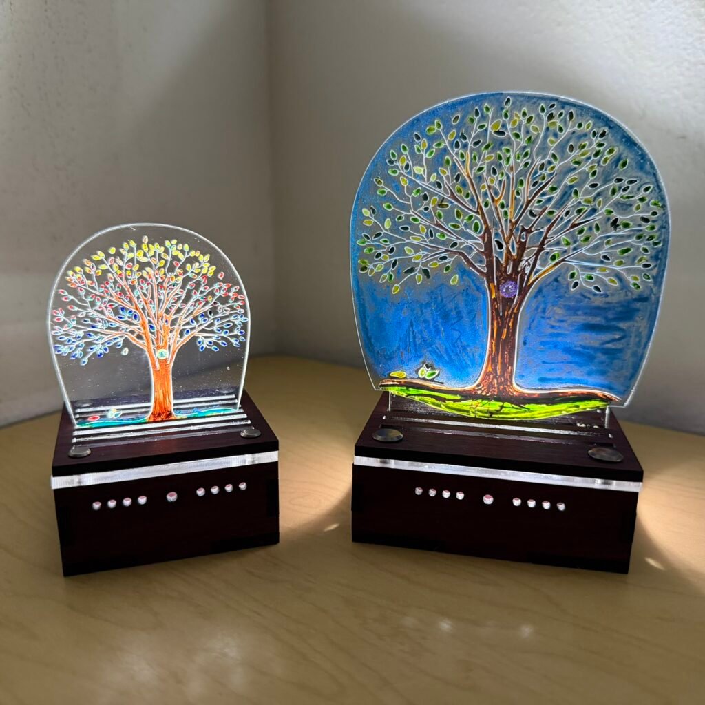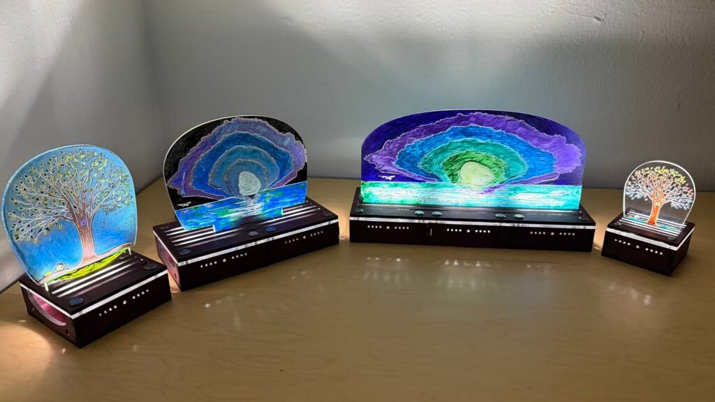 The wooden box base holds an LED light. The lid has two parts – an acrylic (plexiglass) platform and a slotted woooden topper. The acrylic lens designs sit in the slots of the wooden slotted lid.